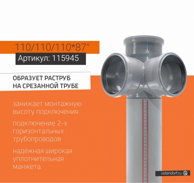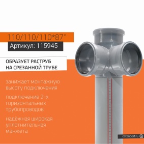 Этот фитинг восстанавливает раструб в месте срезанного конца трубы и позволяет подключить два горизонтальных направления под углом 87° относительно друг друга и вертикальной оси. Это особенно удобно при разводке стоков в условиях ограниченного пространства.