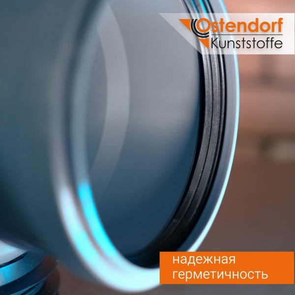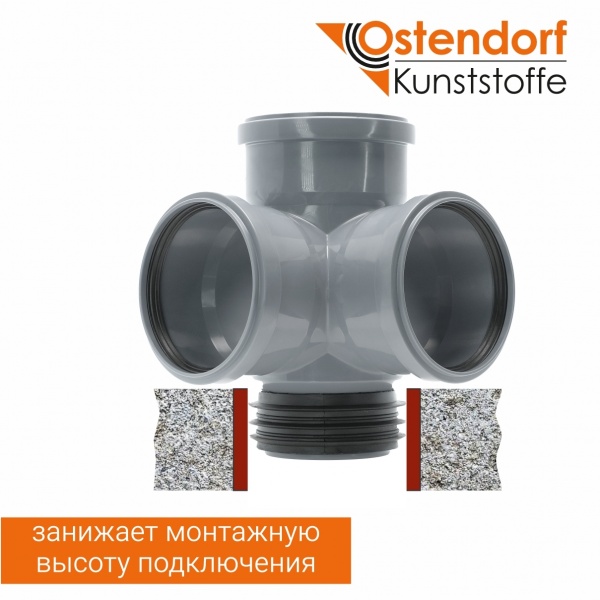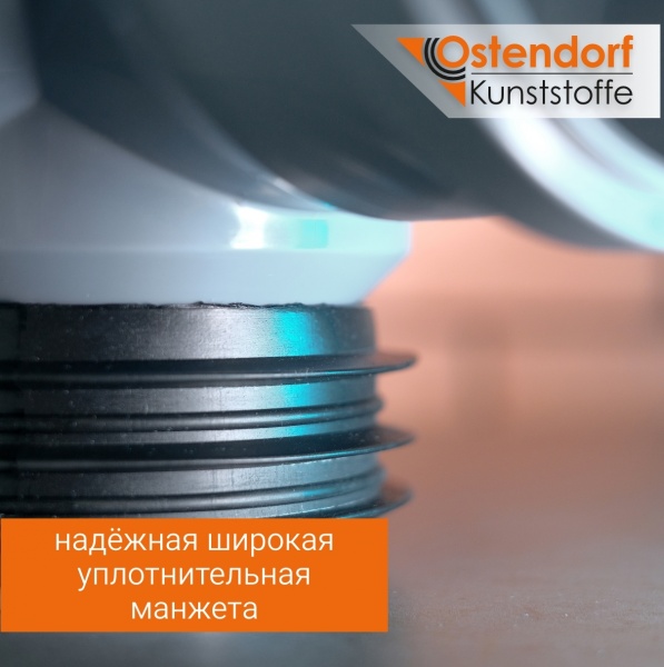Фитинг оснащён немецким тройным уплотнением в раструбах и широкой уплотнительной манжетой в основании. Внутренняя ступенька имеет скос, что минимизирует сопротивление потоку и снижает риск засоров. Оптимальная высота конструкции позволяет осуществить нужное занижение без потери функциональности.